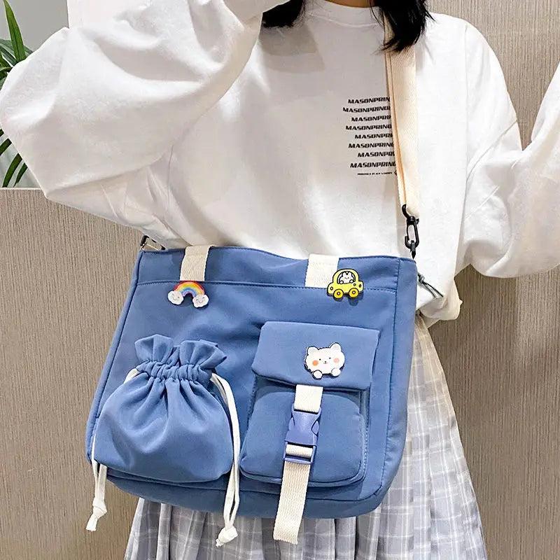 Stay stylish with this Japanese Harajuku crossbody bag perfect for students. It features a spacious design, ideal for carrying books, notebooks, and other essentials. The tote bag can also be used as a shoulder bag for added convenience.