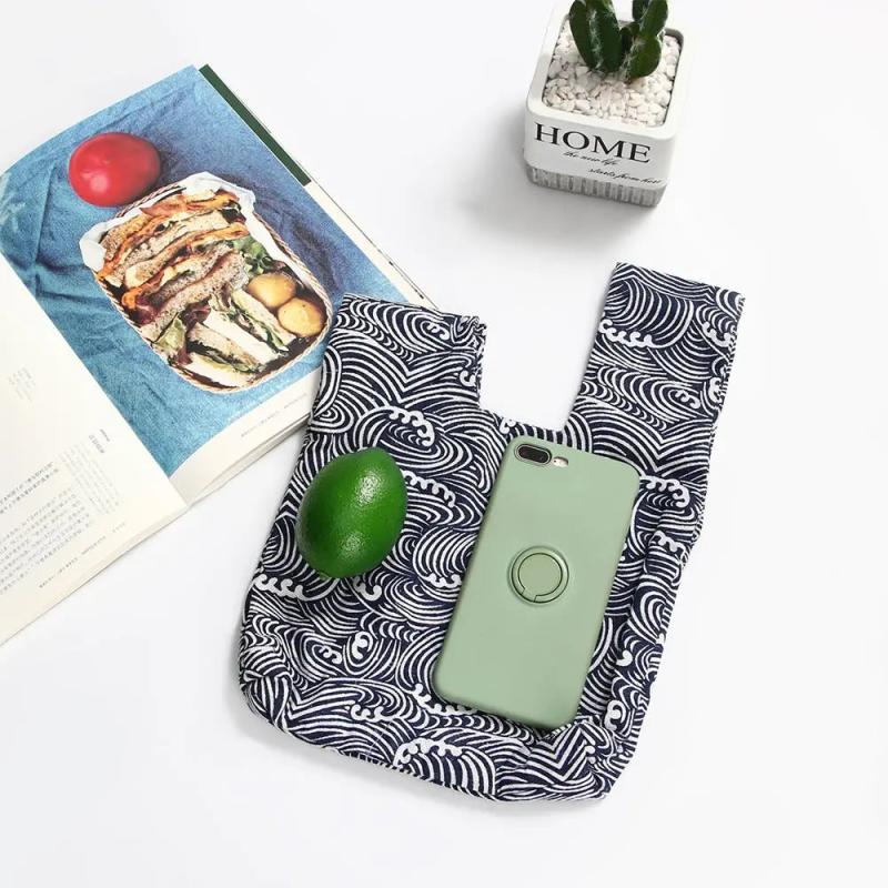 This stylish wrist bag is perfect for carrying your essentials on the go. It features a unique Japanese knot design and a cotton lining for added durability. Ideal for shopping, lunch bag, or walking around town.