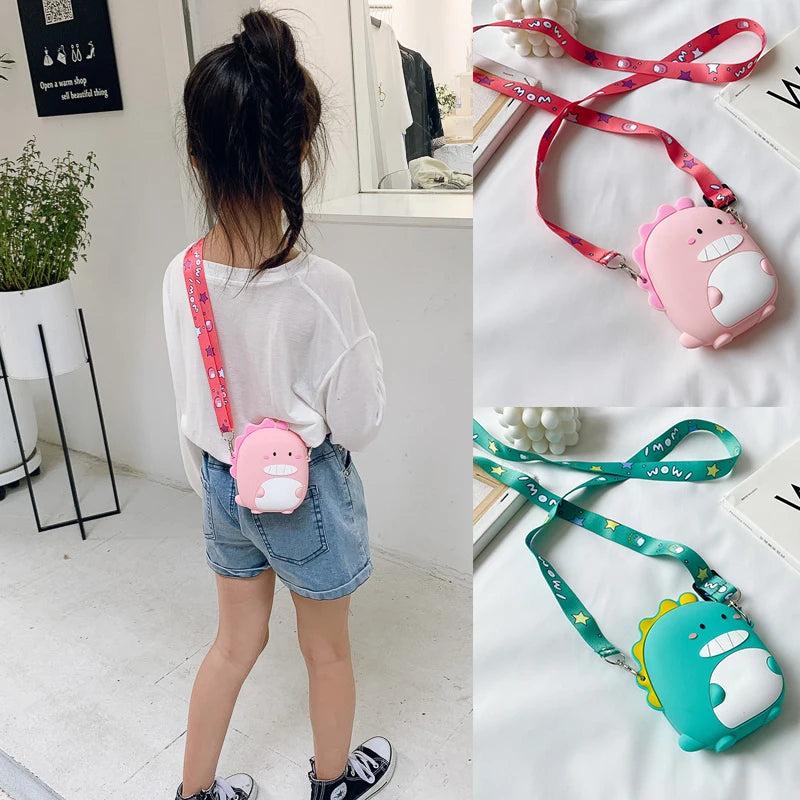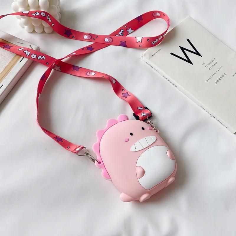Adorable cartoon dinosaur crossbody bag made of silicone, perfect for children to carry phone, wallet or toys. This satchel is a cute and practical accessory for girls.