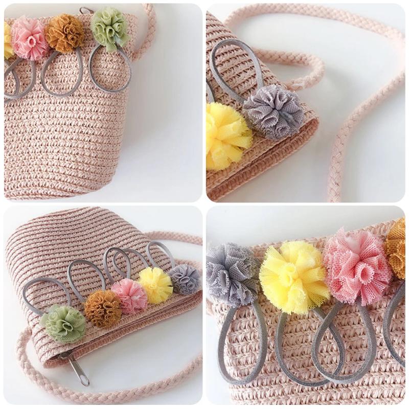 This kids crossbody mini shoulder bag is perfect for children to carry their essentials. It features a beautiful weaving design, ideal for summer outings and beach days. The bag is made of floral rattan material, adding a cute touch to any outfit.
