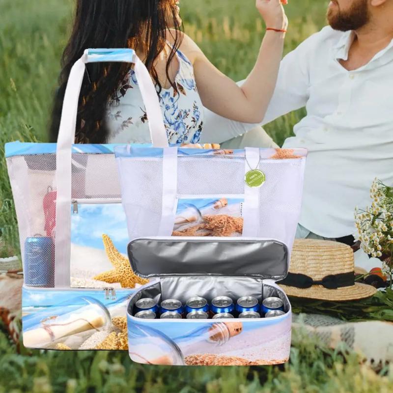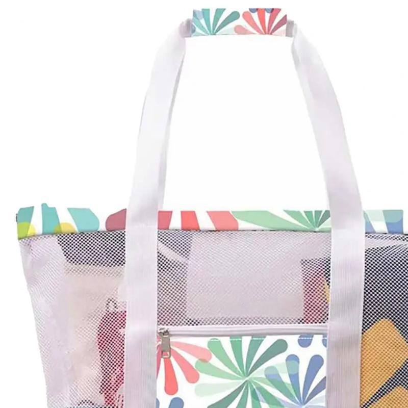 Stay organized at the beach with this portable mesh handbag featuring flower print, thermal ice pack, and practical design for wet and dry items. Perfect for picnics and beach outings.