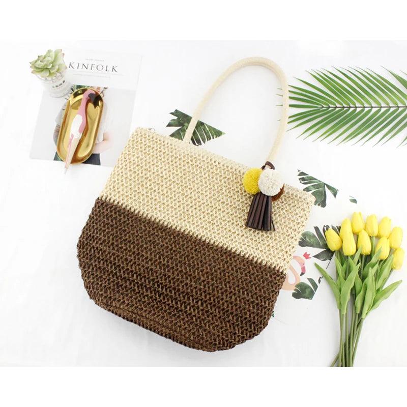 This woven straw bag is perfect for a day at the beach or casual outings. It has a large capacity and features a two-color design with hanging ball accents.