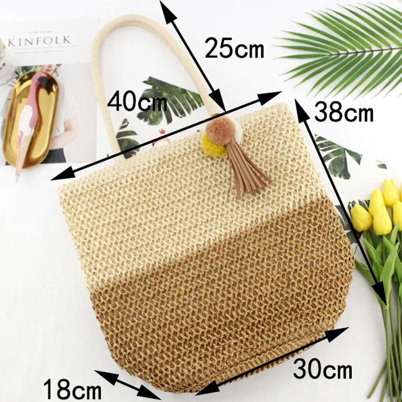 Large-capacity Straw Beach Bag with Hanging Ball, Shoulder Handbag