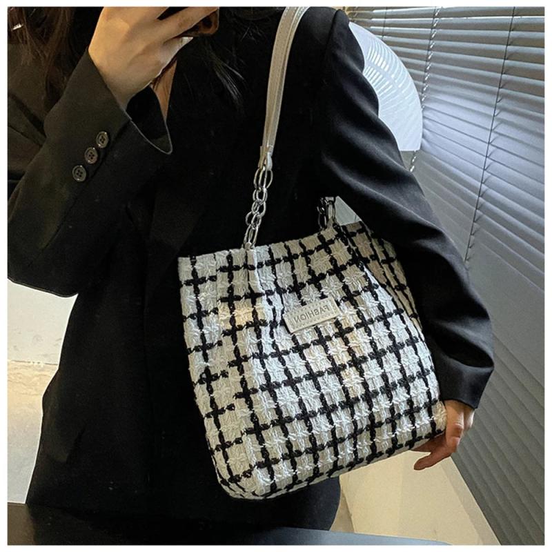 Spacious and stylish tote shoulder bags with plaid design and contrasting colors, perfect for shopping and travel.