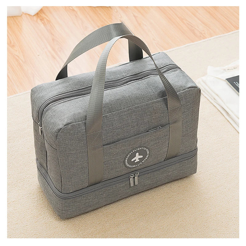 This travel duffle bag features a dry-wet separation design, perfect for the beach or fitness needs. It is waterproof and spacious, ideal for storing clothing and essentials.