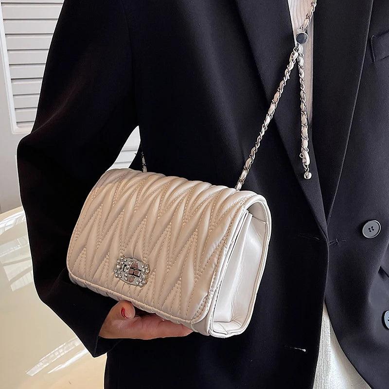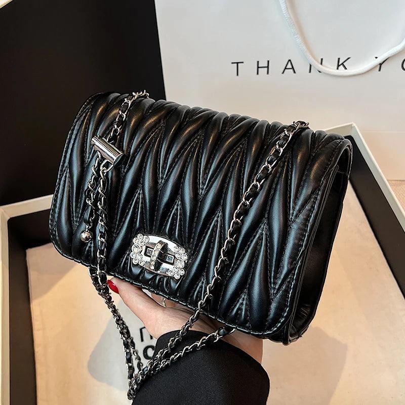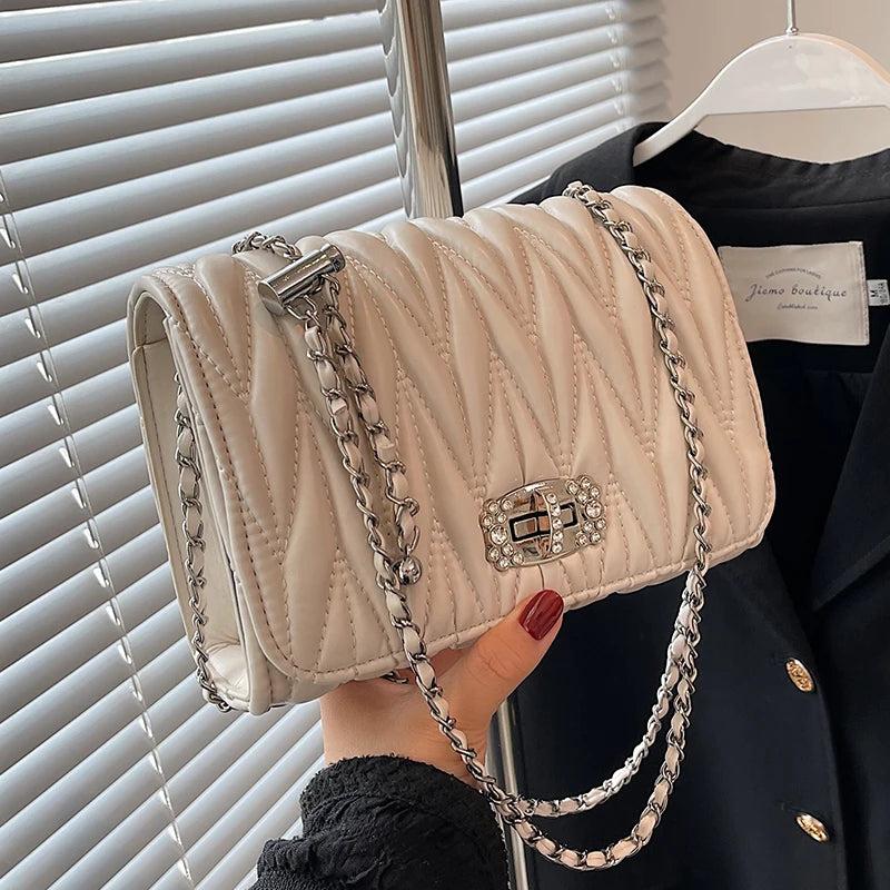 Elegant and stylish square bag with chain handle for a chic look. Perfect for carrying essentials on the go.