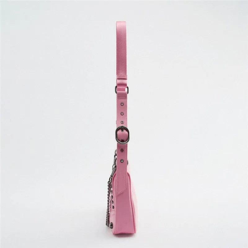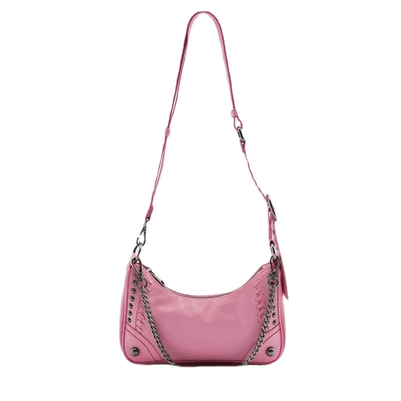 This punk motorcycle shoulder bag is made of soft PU leather with rivet accents. It can be worn as a crossbody bag with its chain strap, perfect for a casual and edgy look.