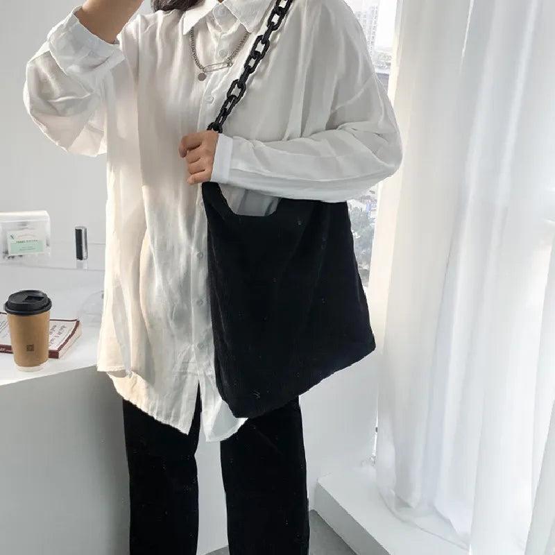 Stay stylish with this large capacity shoulder bag featuring a leopard/black design made of corduroy. Perfect for everyday use.