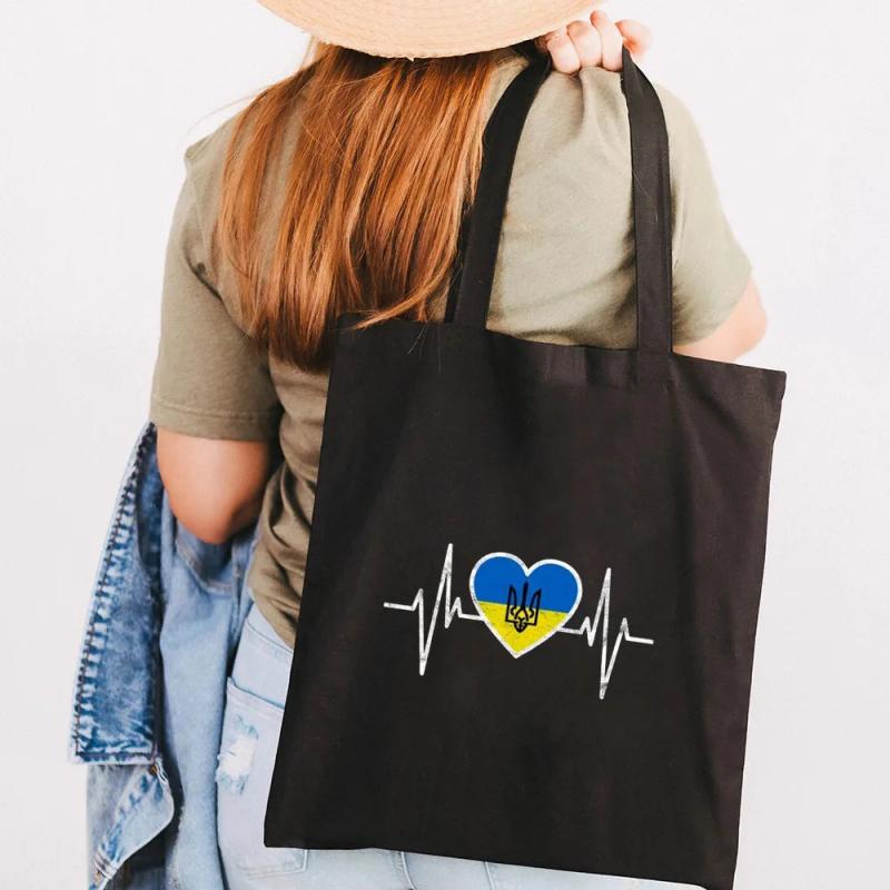 - Canvas shoulder bag with love heart, Ukraine flag, and sunflower design