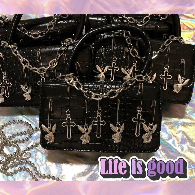 Description:This shoulder bag combines metal punk biker style with a touch of dark gothic flair, perfect for the edgy fashionista. Features a unique cross paper clip rabbit design.Features: Moto biker style accessory for women Harajuku gothic inspired design Spacious interior for all your essentials Adjustable strap for customized fit Statement...