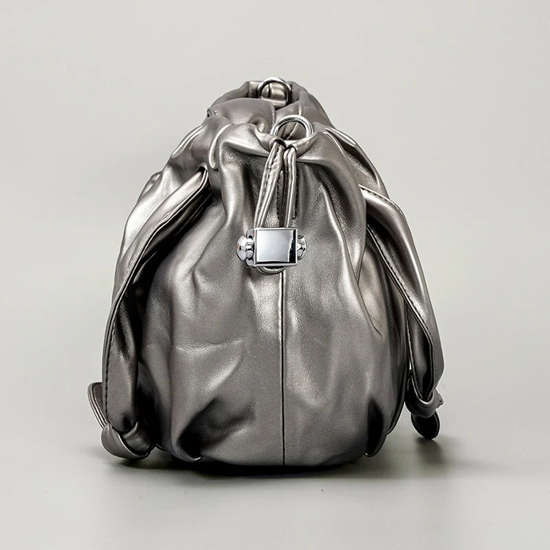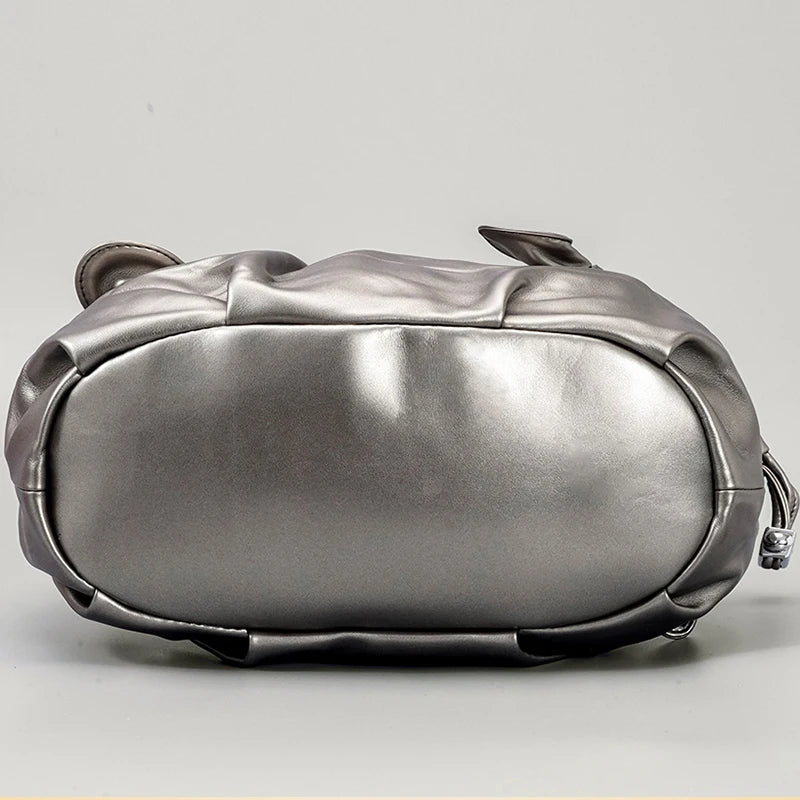 Elevate your style with this metallic gray drawstring bag featuring laser leather pattern. Made of high-quality PU leather, it's perfect for spring fashion.