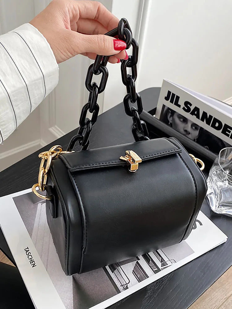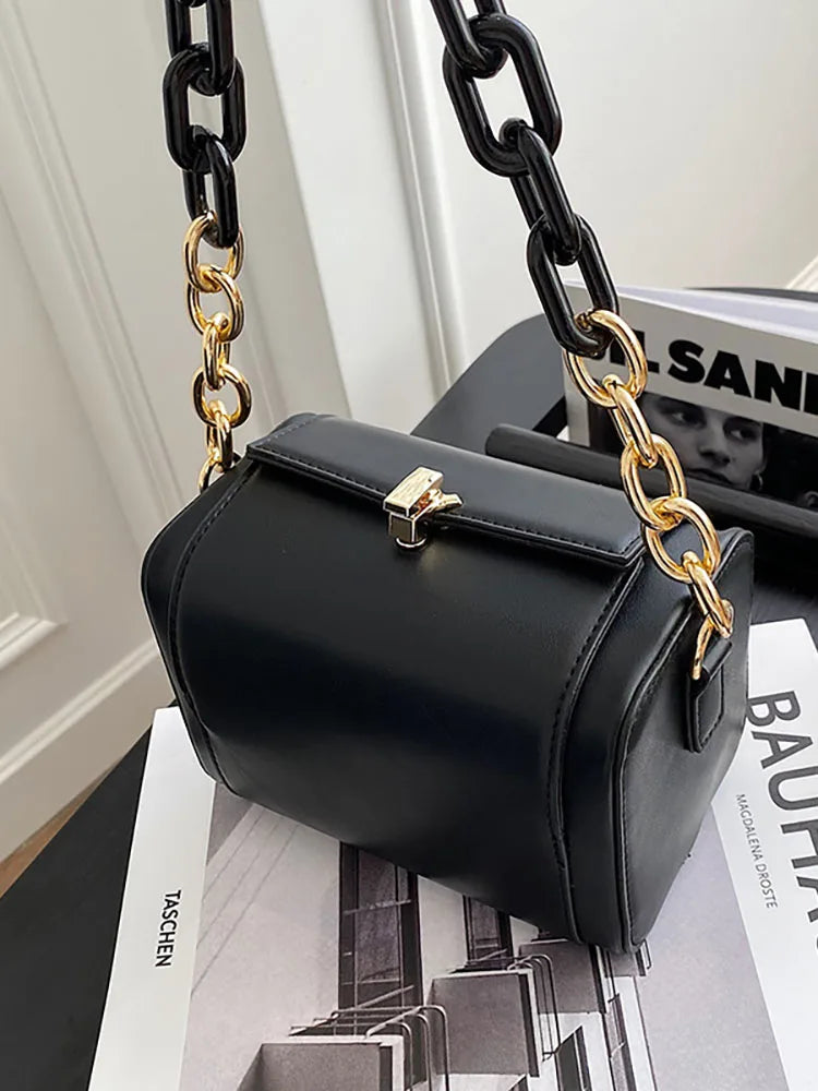 This mini box crossbody bag is made of PU leather and features a stylish chain strap. It's a versatile accessory that can be worn for various occasions.