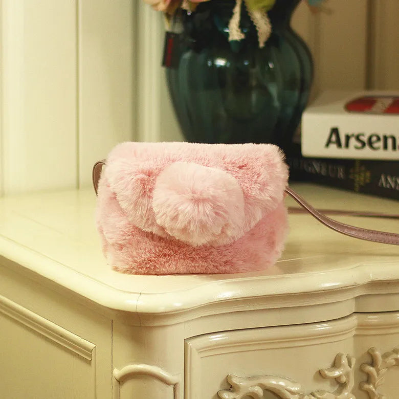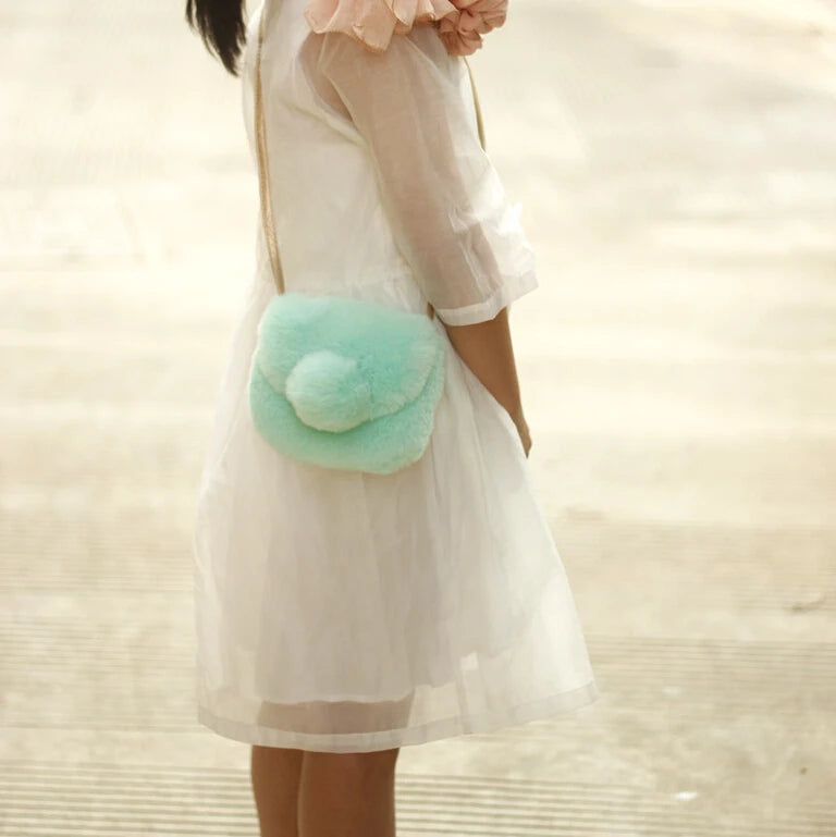 This adorable mini handbag is perfect for little girls, made of soft plush material with a cute pom pom decoration. It's a crossbody bag that your child will love to carry around!