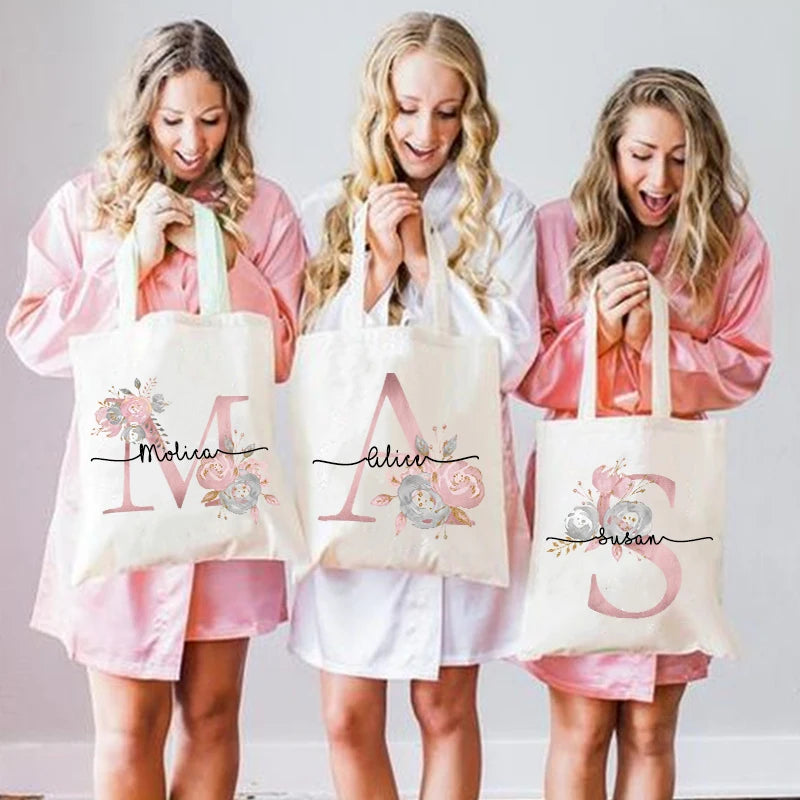 Get ready for the wedding with these custom bridesmaid tote bags. Perfect for bachelorette parties and bridal showers!
