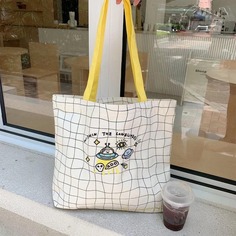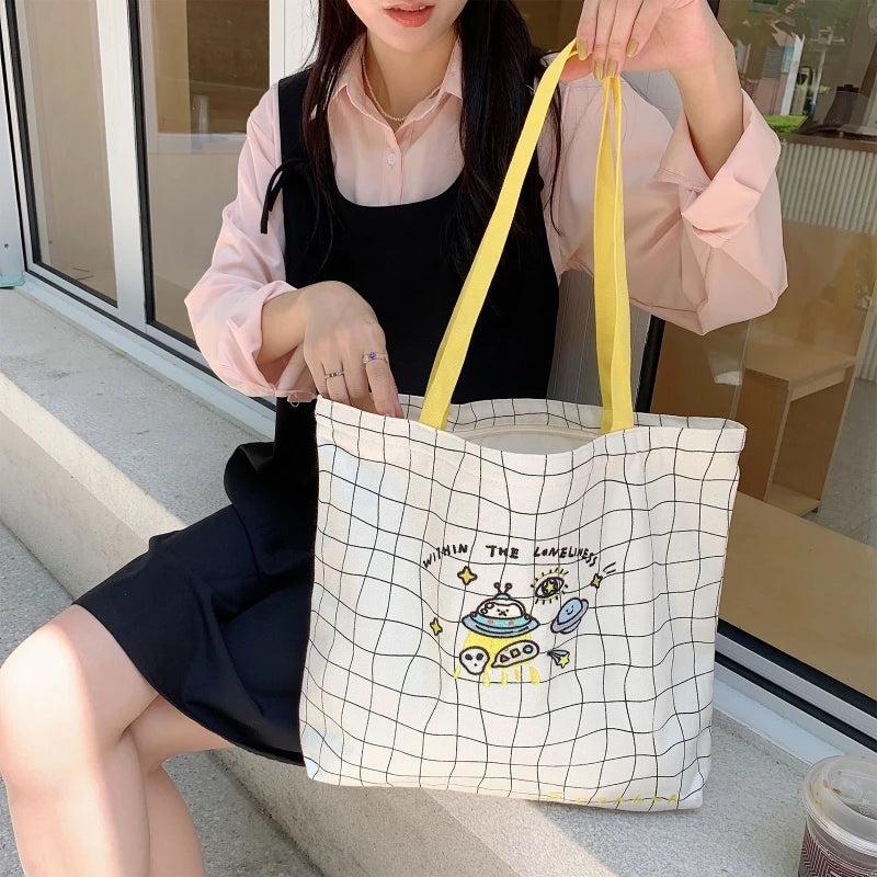 Plaid Canvas Shoulder Bag Embroidered Handbag Lady Casual Tote