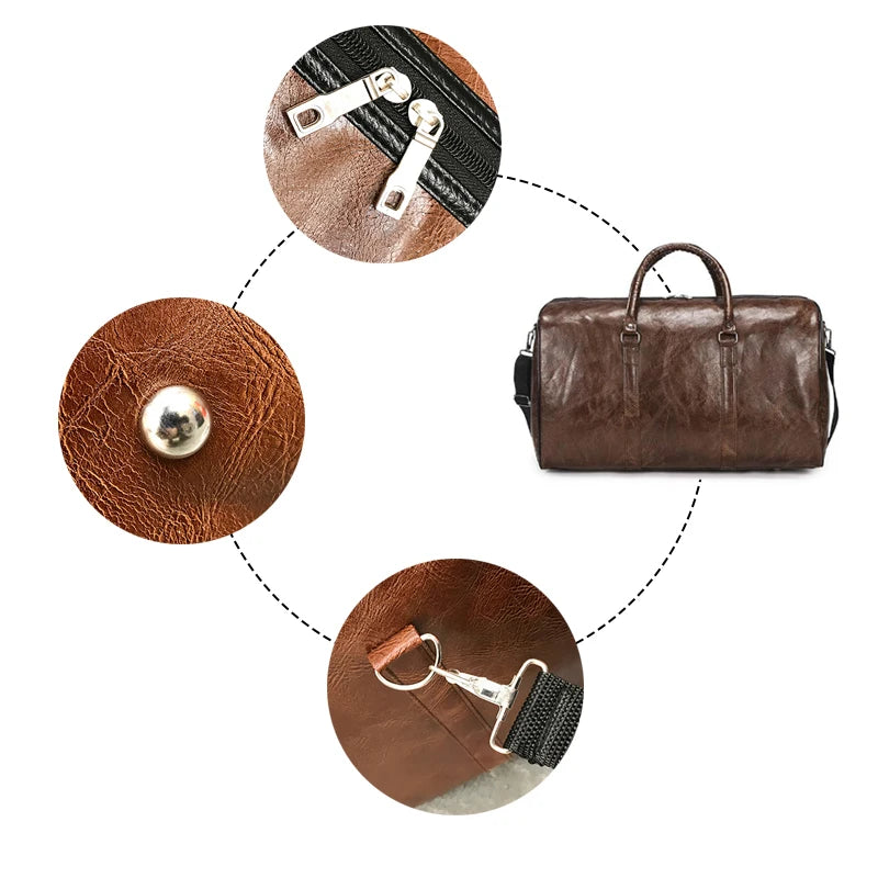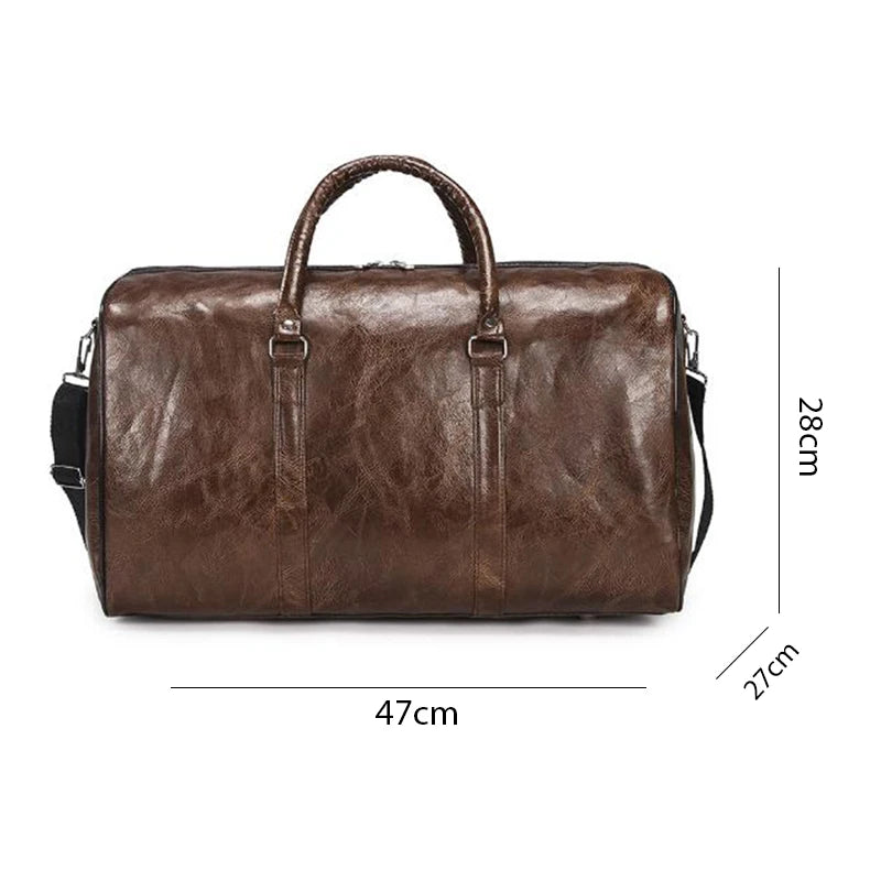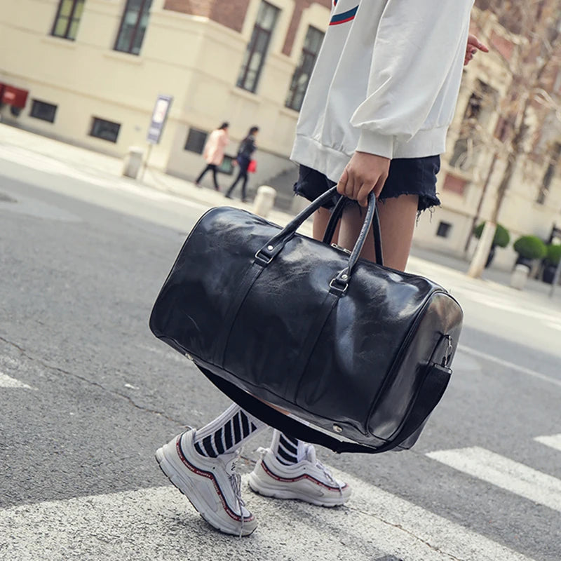 This stylish travel bag is made of high-quality PU material with a large capacity. It's waterproof, perfect for short-distance trips, sports, and fitness activities.