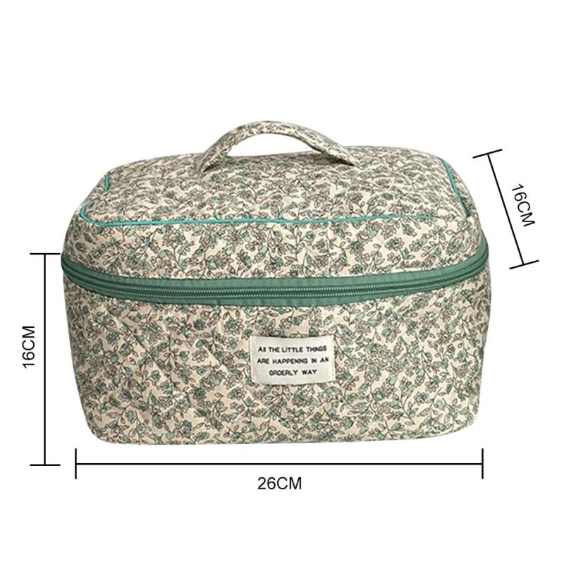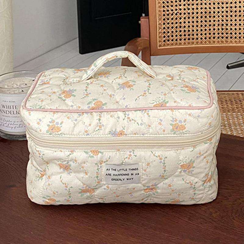 This quilted makeup handbag is perfect for travel or home use. It features beautiful floral prints and offers a large capacity for all your toiletries.