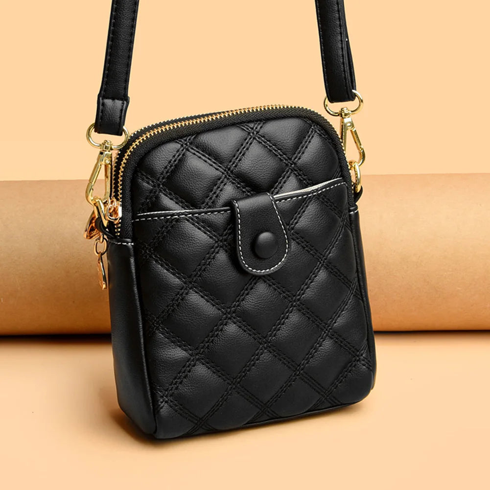 This small and portable cell phone purse is a stylish accessory for women. It features a quilted rhombus design and an adjustable strap for convenience.
