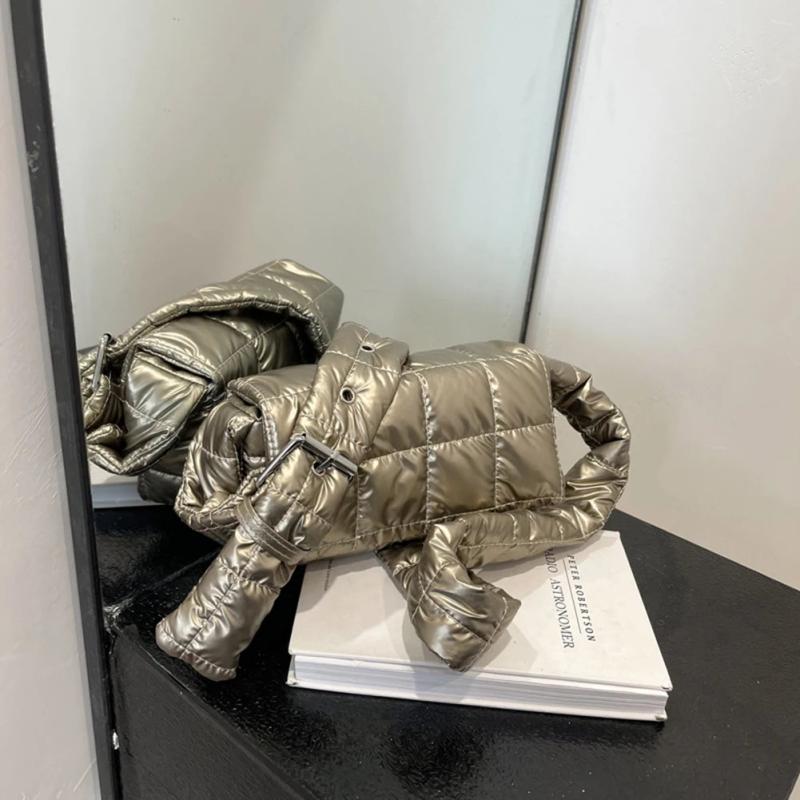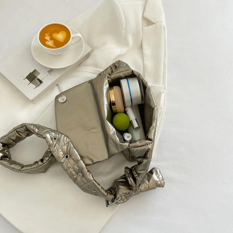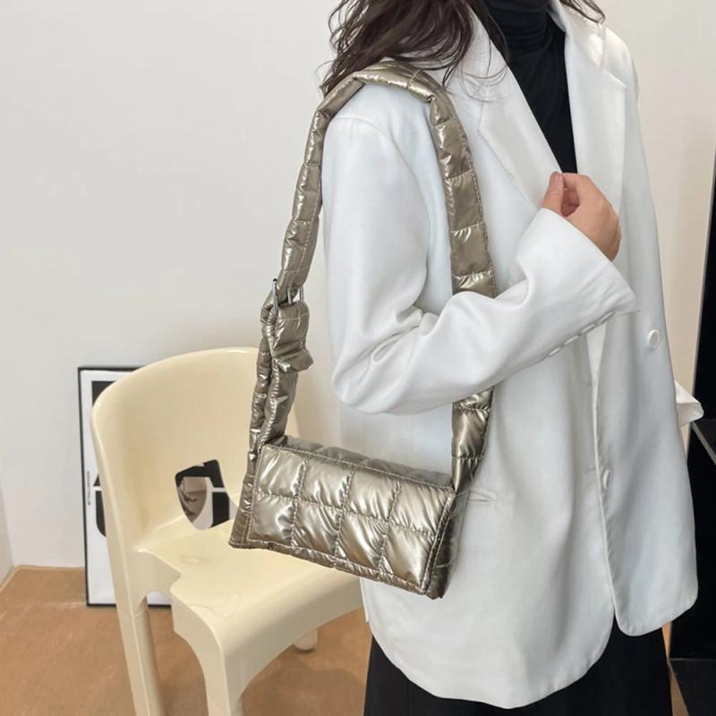 This stylish shoulder bag is perfect for shopping and travel during autumn and winter. Made of soft, solid nylon material, it features a quilted design with a buckle closure for added security.