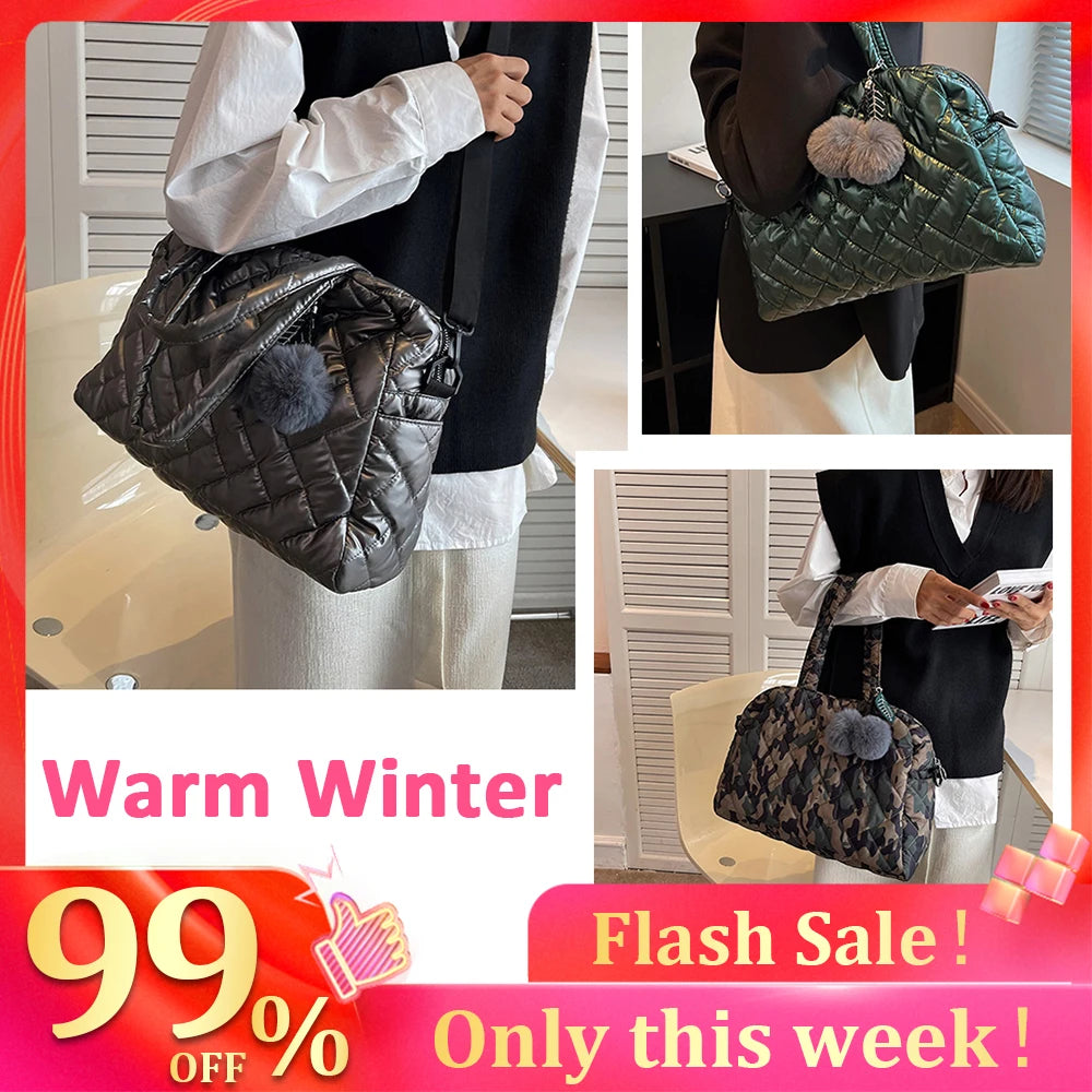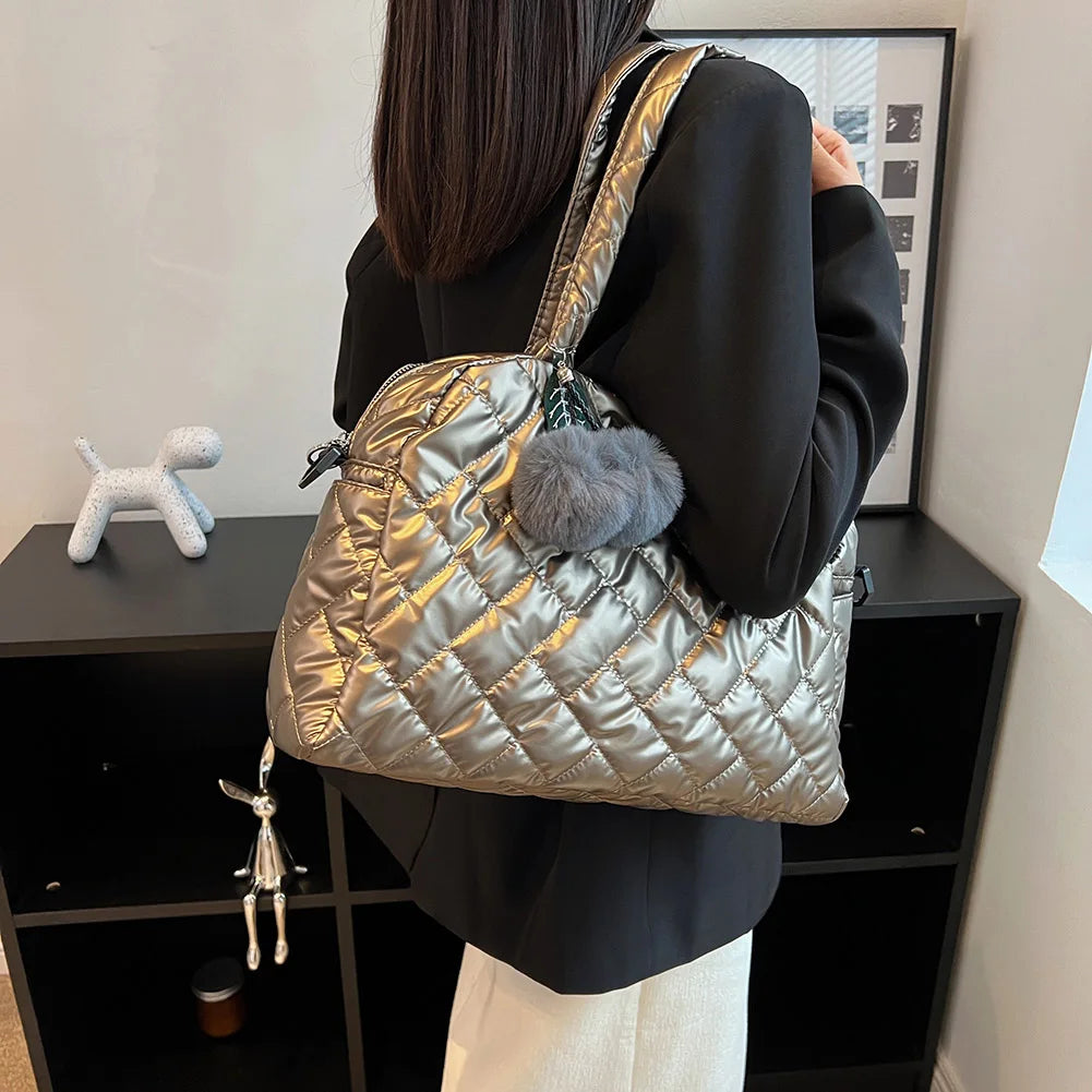 Quilted Shoulder Bag with Pompom Pendant, Large Capacity Messenger Bag