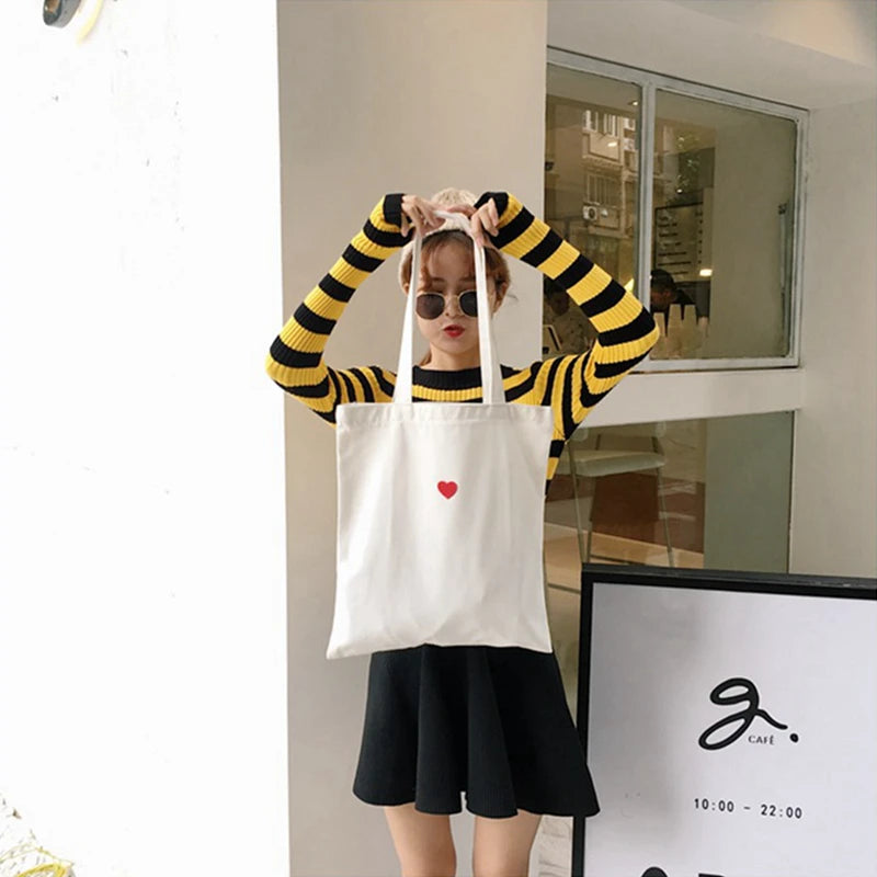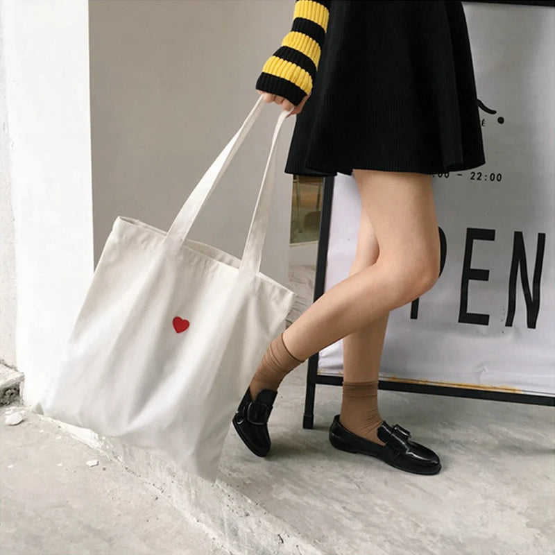 This canvas bag features a lovely red heart embroidery patch, perfect for spreading love while shopping or running errands. The bag is made from recycled materials and has a convenient zipper closure.