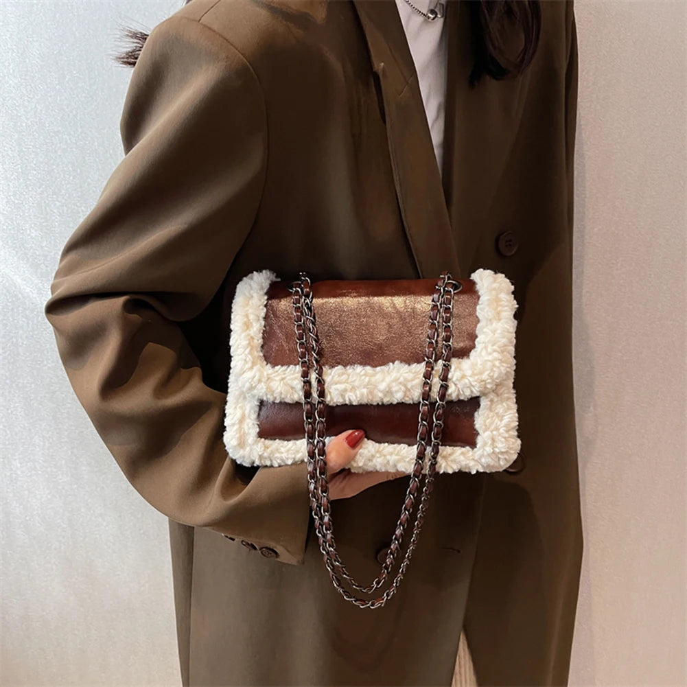 This stylish shoulder bag features a retro design with fleece and faux suede material. Perfect for street style and vintage fashion lovers.