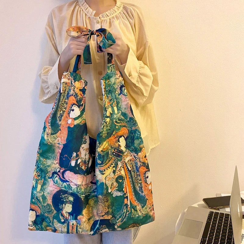 This handbag features a retro design with manual painting, perfect for school or shopping. It is made of durable canvas material and offers a large capacity with a foldable motion.