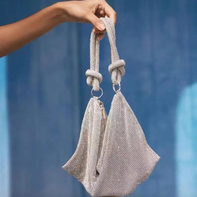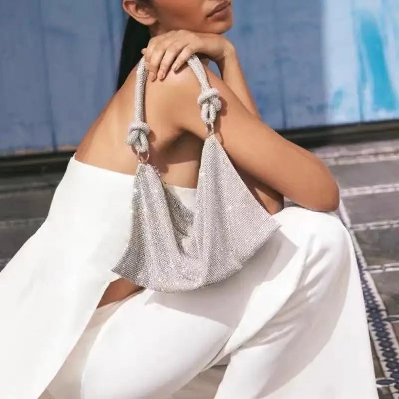 Make a dazzling statement with this silver crystal evening clutch bag adorned with rhinestones. Perfect for dinner parties, weddings, or special occasions.