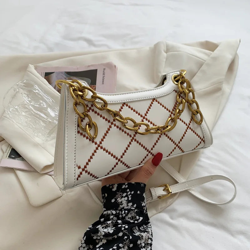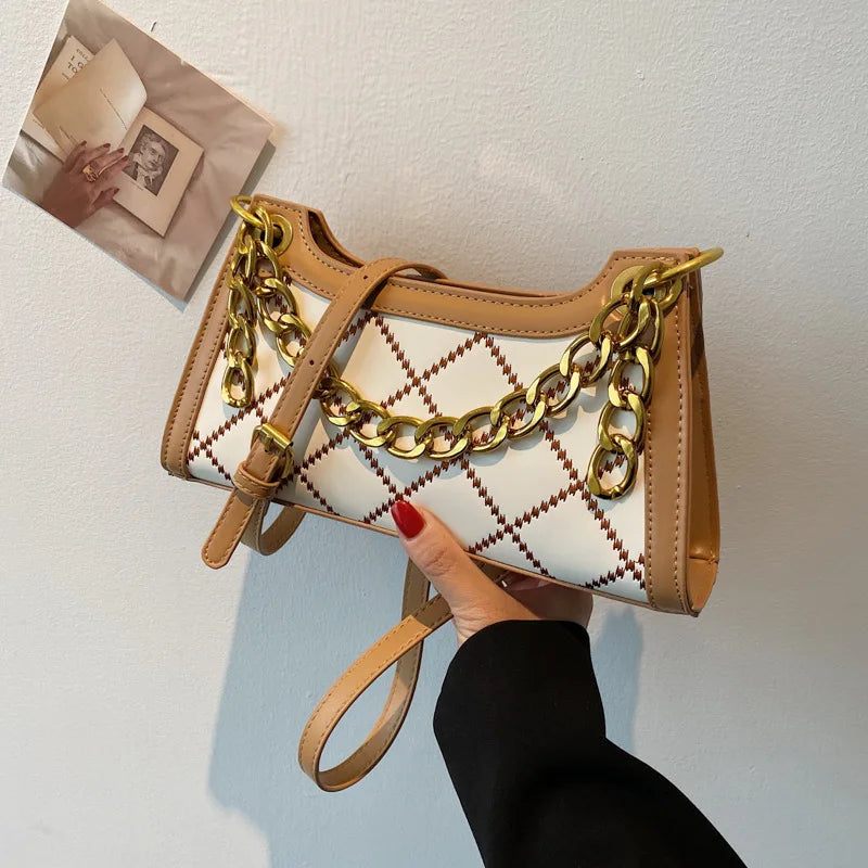 Rhombus Printed Chain Leather Shoulder Handbag Zipper Messenger Purse