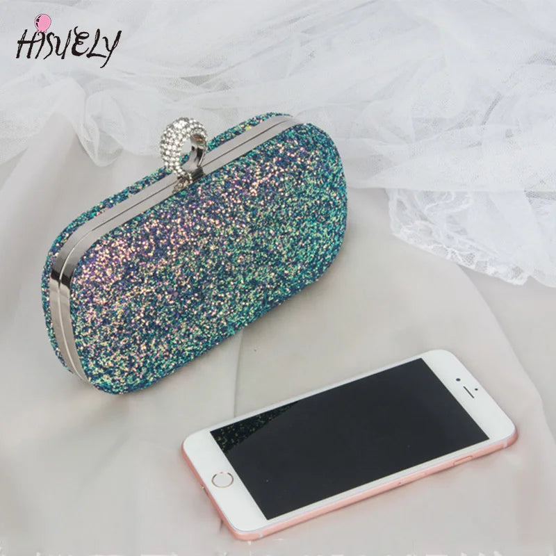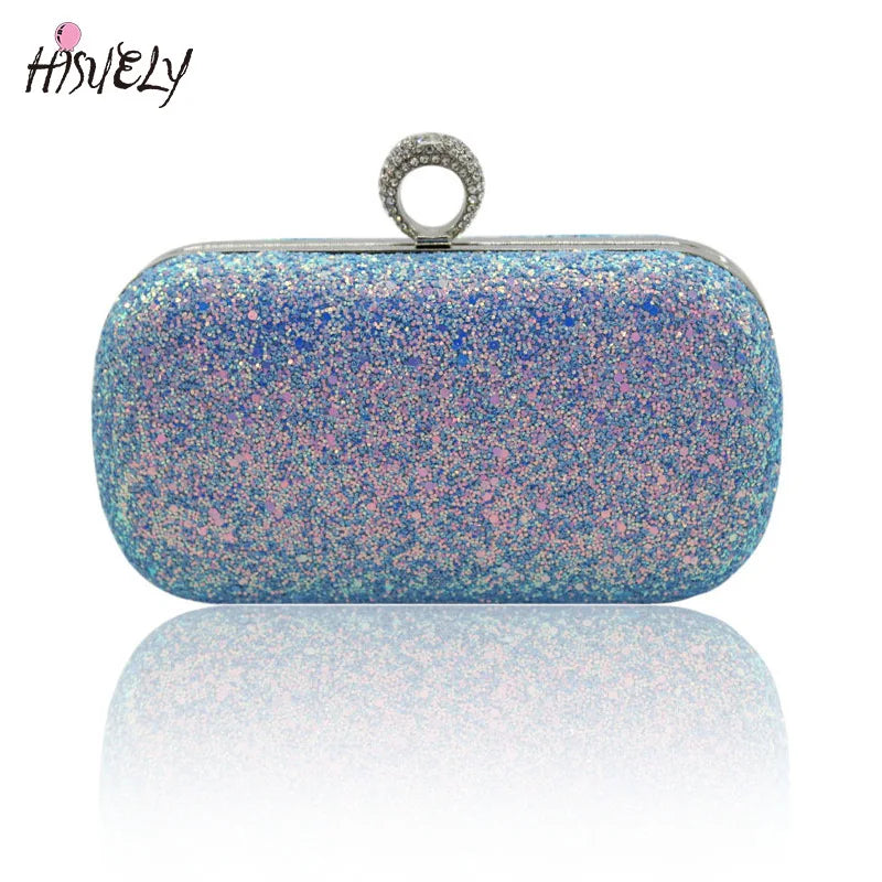 Elegant sequin dinner bag designed for women, perfect for parties and events. This portable messenger bag features a creative ring closure and can be used as a handbag or wallet.