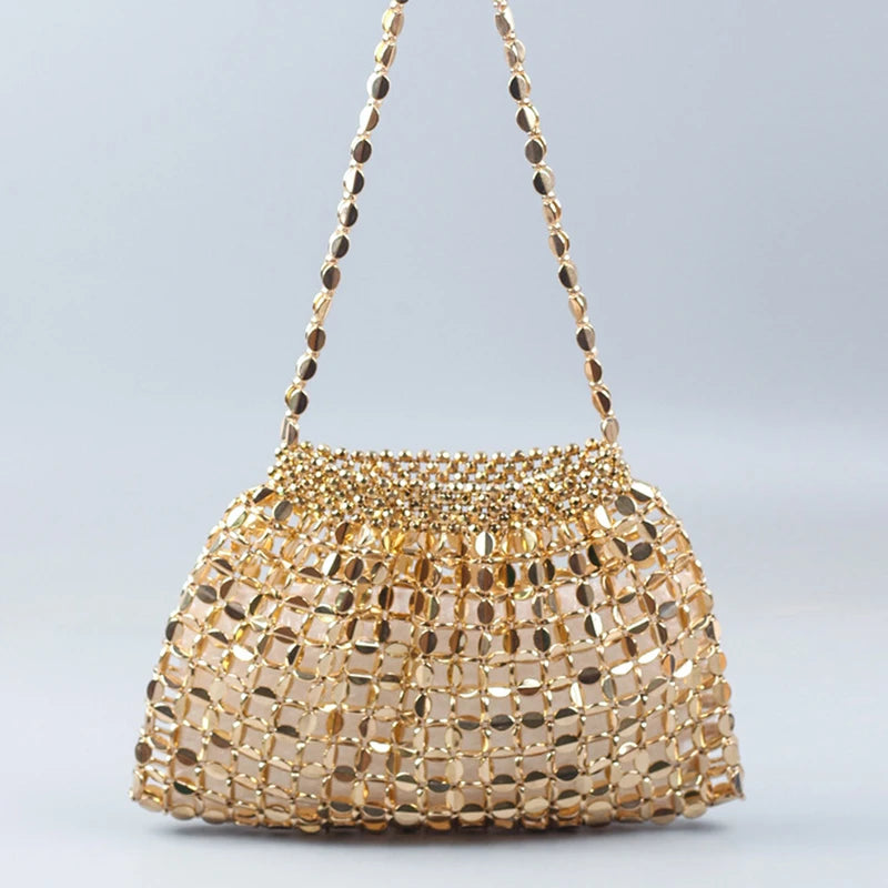This stunning silver evening clutch features intricate woven beads in a large dumpling shape, perfect for parties and special occasions.