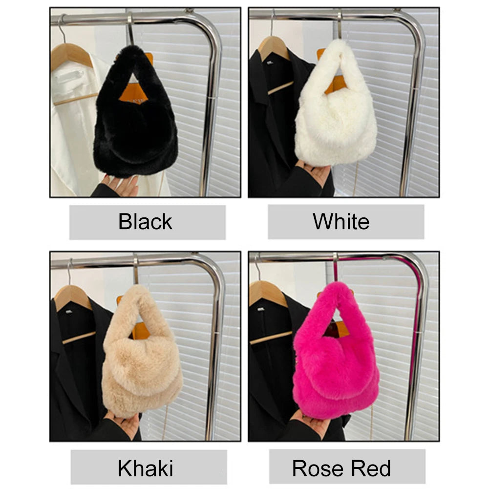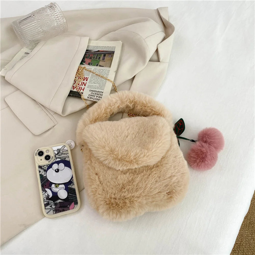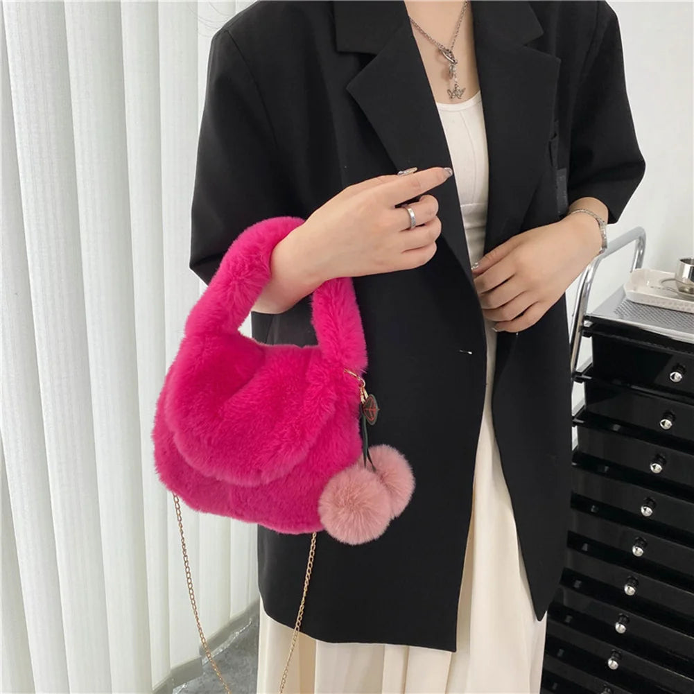 Stay stylish and cozy with this soft plush fluffy fur handbag featuring a trendy pompom pendant. Perfect for the autumn and winter seasons.