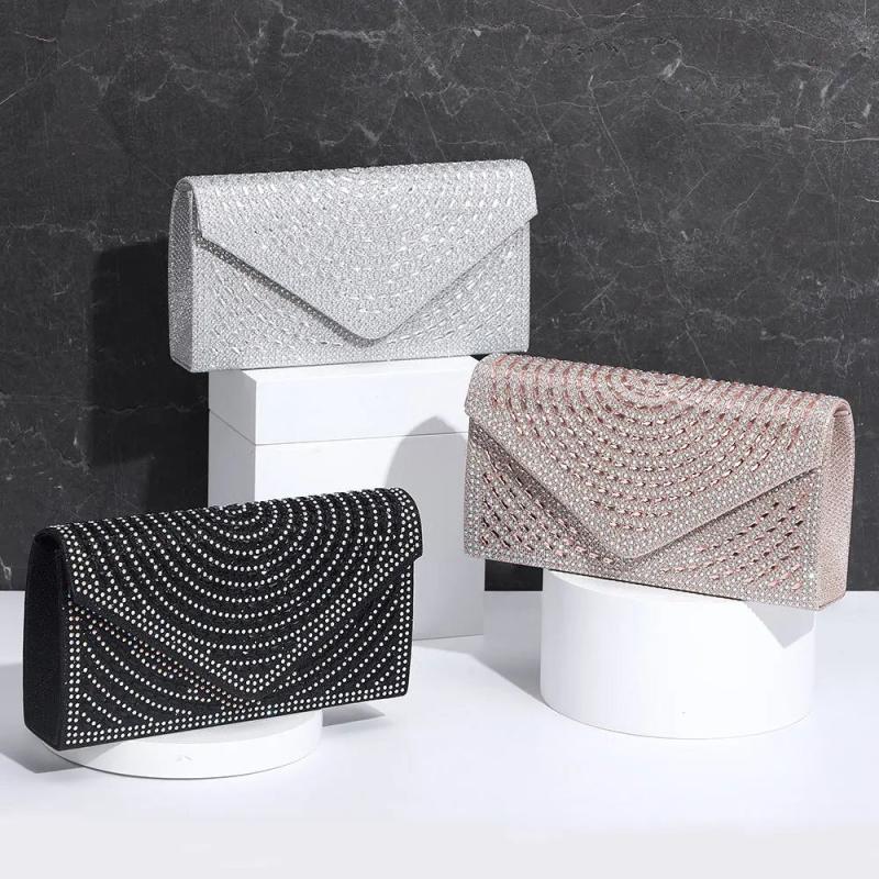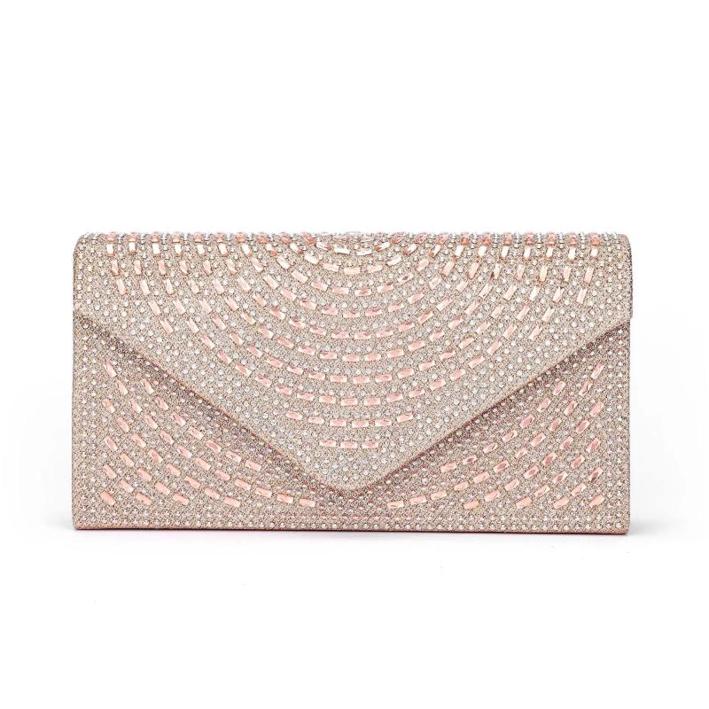 Elegant silver champagne PU envelope bag perfect for cocktail parties, banquets, and weddings. Features rhinestone studs and a phone compartment.