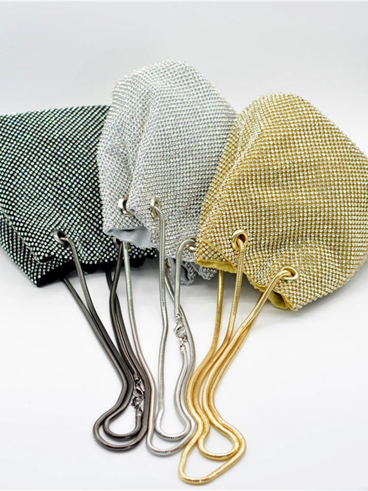 This stunning silver clutch bag is adorned with shimmering crystal rhinestones, making it the perfect accessory for evening events. It can be worn as a shoulder bag or carried as a handbag.