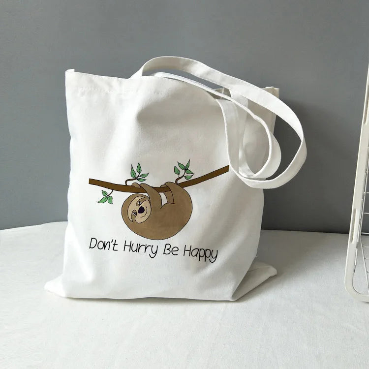 Sloth Print Canvas Tote Bag - Don't Hurry Be Happy