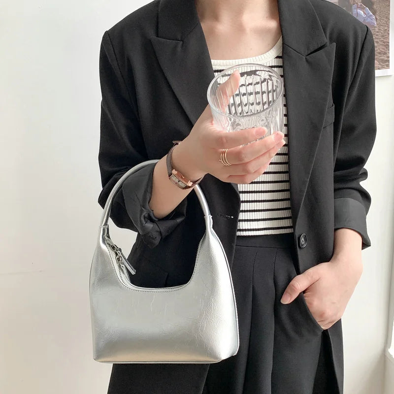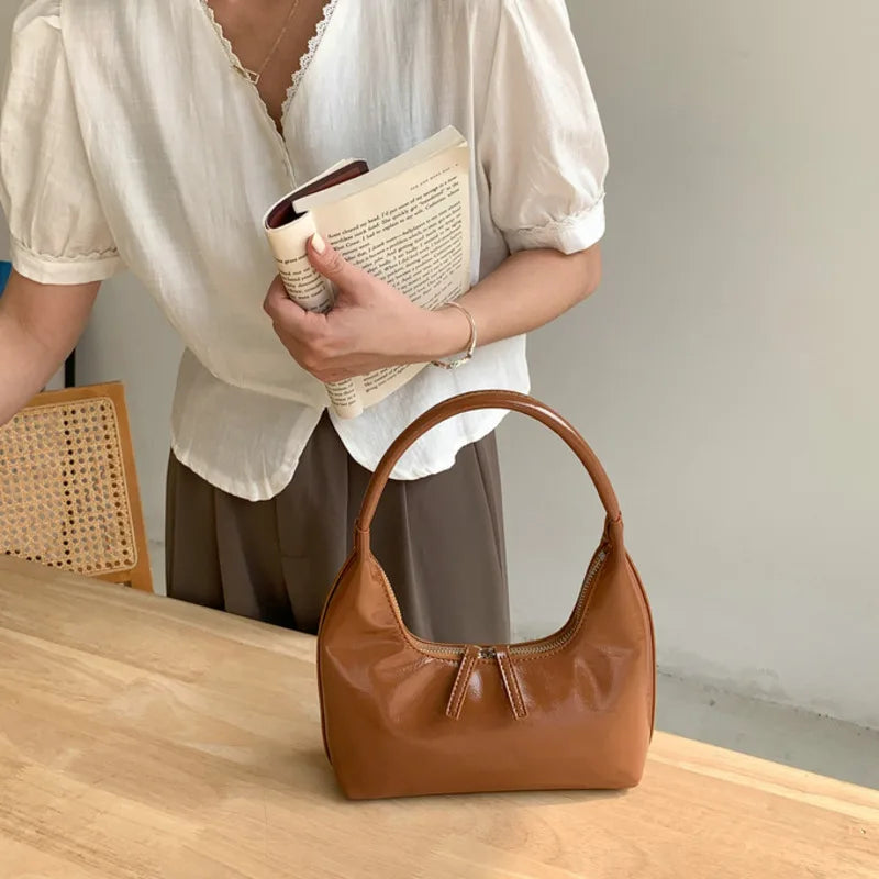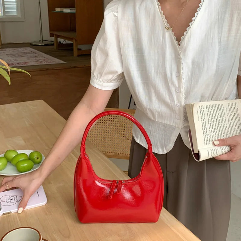 Stay stylish with this half moon zipper handbag made of patent leather. Perfect for everyday use or any occasion.