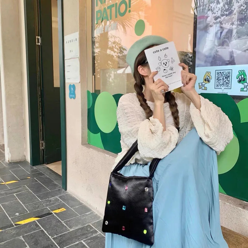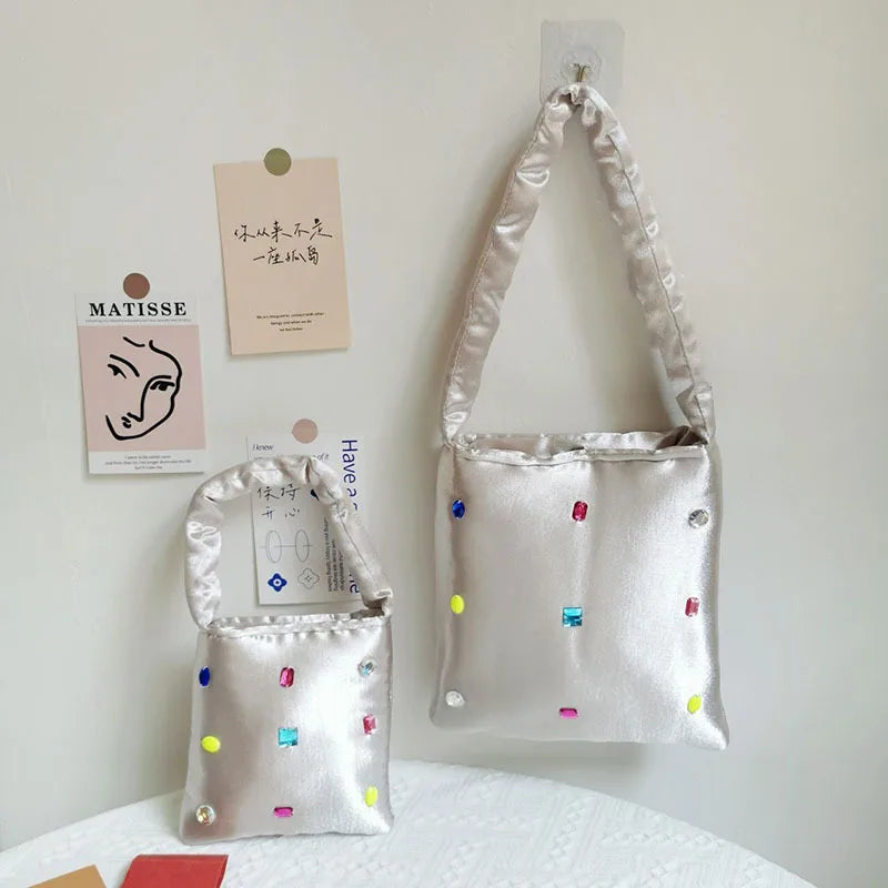 Small Square Bag Hand Sewn Gem Shoulder Bag Satin Diamond Inlaid