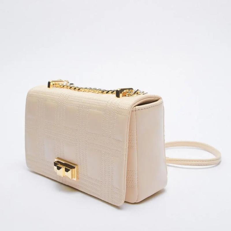 This soft leather small square bag features a stylish line decoration chain design. It can be worn as a shoulder bag or messenger bag.