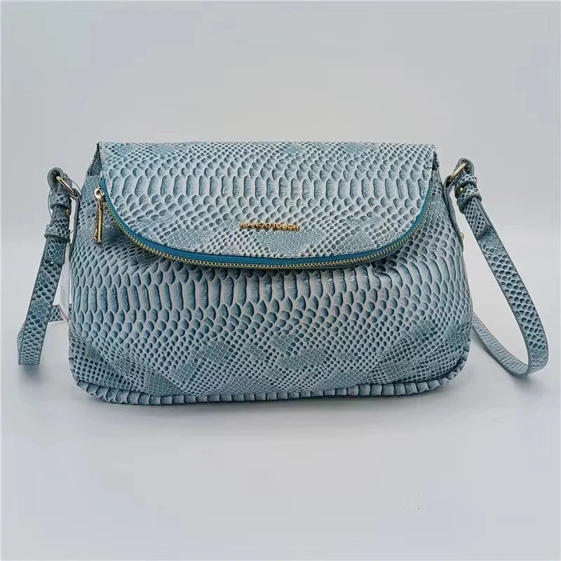 This stylish mango handbag features a chic snake pattern design. It can be carried as a shoulder or crossbody bag and has a convenient zipper closure. The perfect accessory for any outfit.
