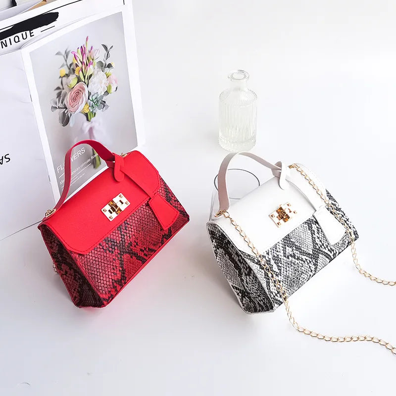This stylish handbag features a snake pattern design and is perfect for any occasion. It comes with a chain strap and is ideal for carrying essentials.