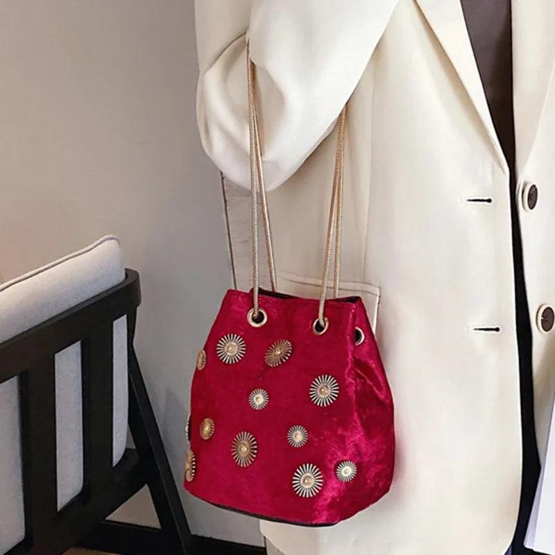 This small bag is perfect for shopping and features a stylish design with a golden chain shoulder strap.