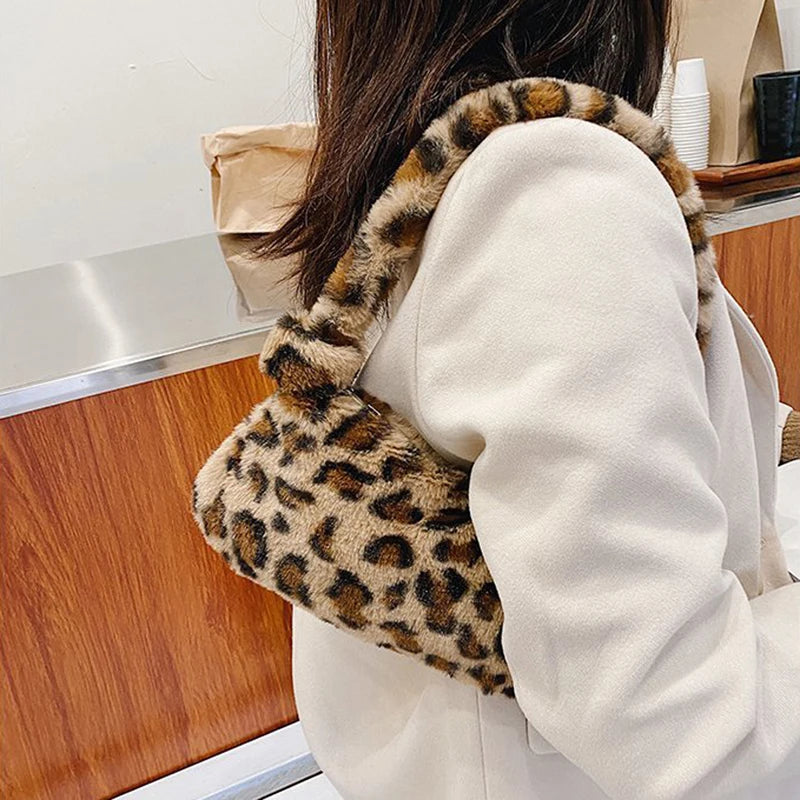 Add a touch of luxury to your outfit with this soft plush shoulder bag. Available in solid color or leopard print, this bag features a light zipper closure for easy access.