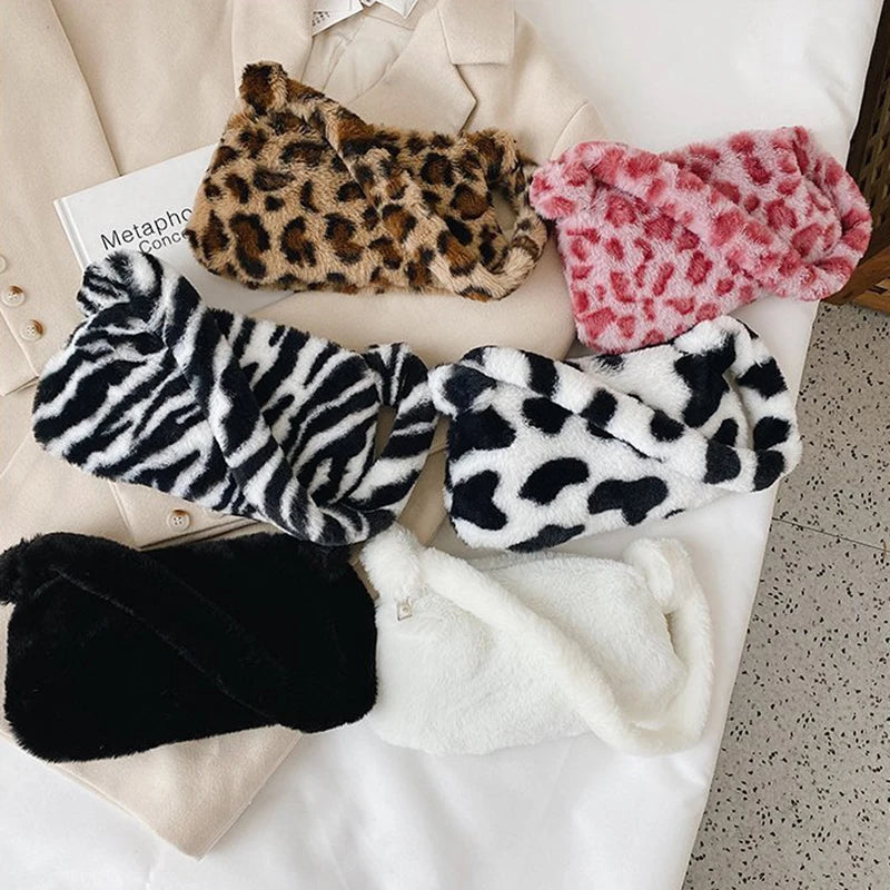 Soft Plush Fluffy Shoulder Bag Solid Color/Leopard Print Zipper Tote Handb
