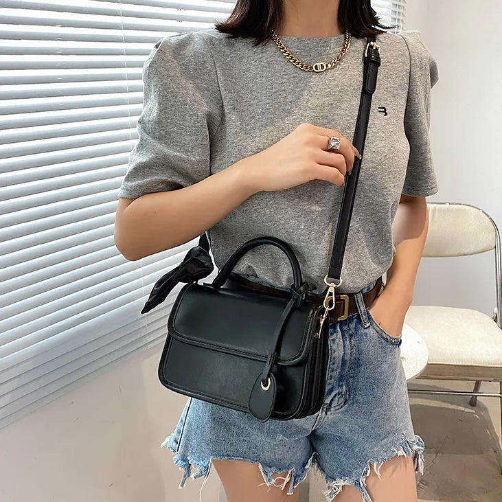 This high-end solid PU female bag features a summer flap wrap silk scarf design. It can be used as a casual handbag or a stylish messenger bag.