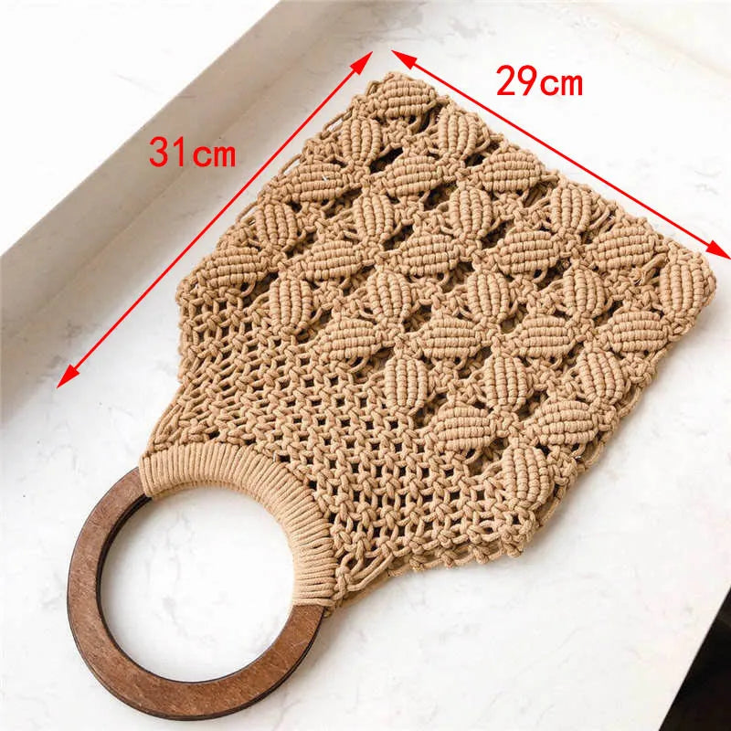 Spring Summer Woven Bag Hollow Beach Wooden Handle Ring Straw Handbag