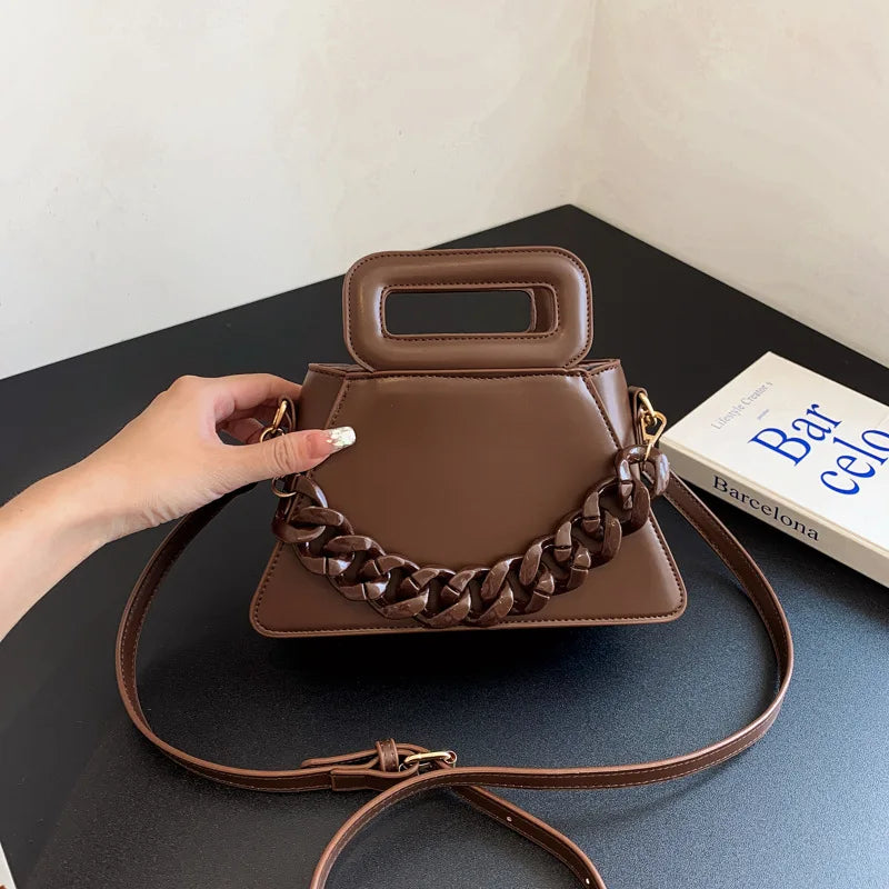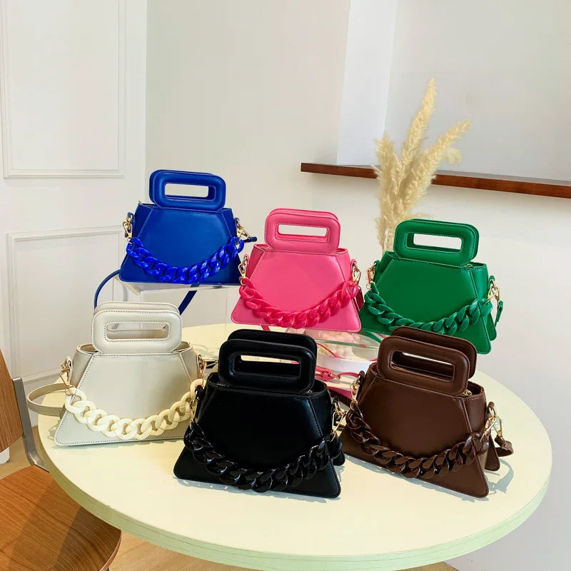 This stylish shoulder bag features a unique acrylic chains design with a rectangular handle, perfect for women on the go.