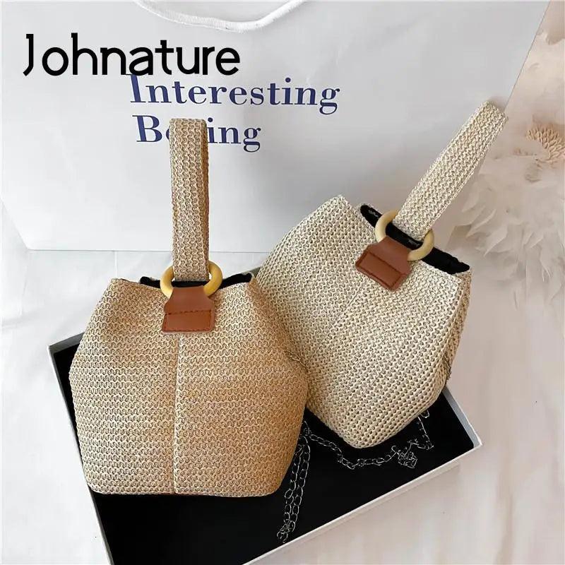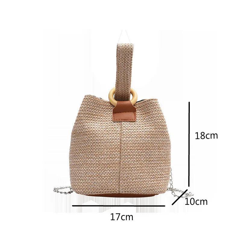 Stay stylish with this summer ladies straw bucket bag that is perfect for the beach. It features a versatile woven design and is a casual yet chic accessory.