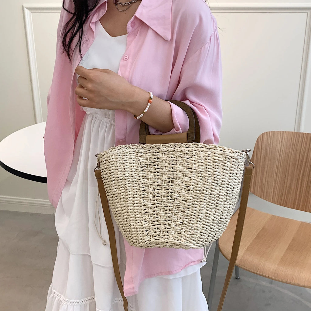 Get ready for a beach day with this stylish straw rattan shoulder bucket crossbody bag featuring a short wooden handle. Perfect for carrying your essentials in a trendy way.