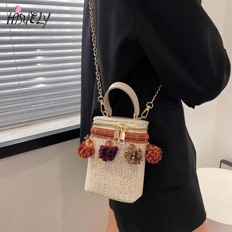 Description:This stylish straw bag with tassels is perfect for summer getaways or trips to the beach. It features a woven chain design for a bohemian look.Features: Ideal for summer vacations and beach trips Chic tassel and woven chain design Spacious bucket shape for all your essentials Versatile shoulder bag for...