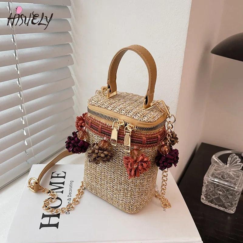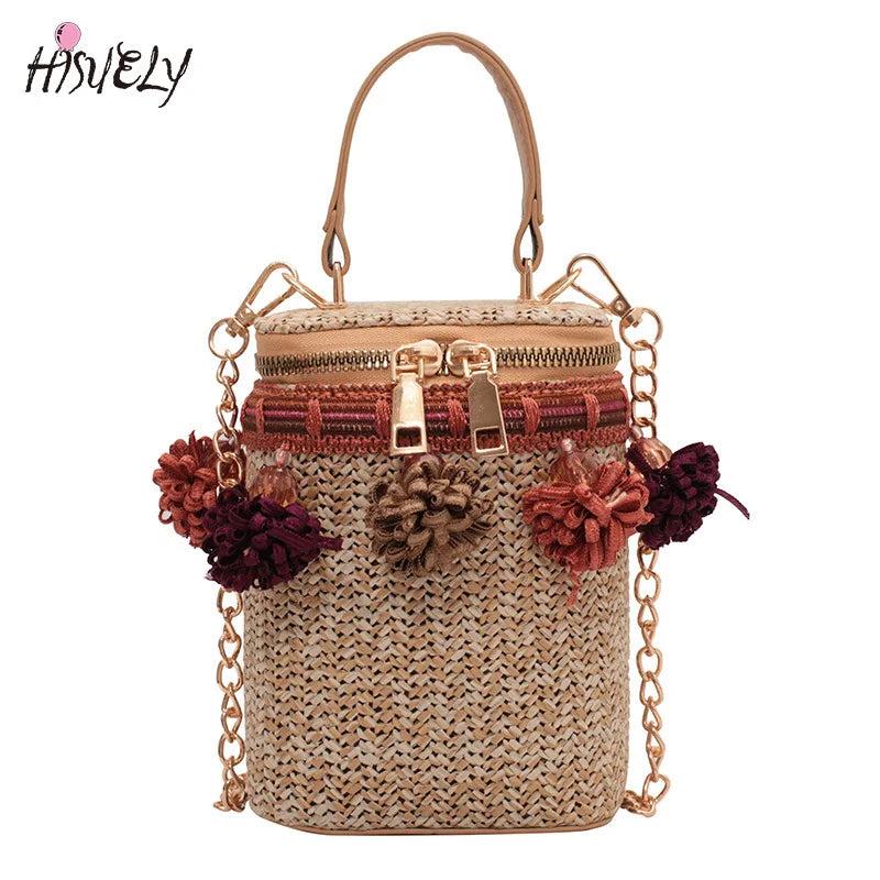This stylish straw bag with tassels is perfect for summer getaways or trips to the beach. It features a woven chain design for a bohemian look.